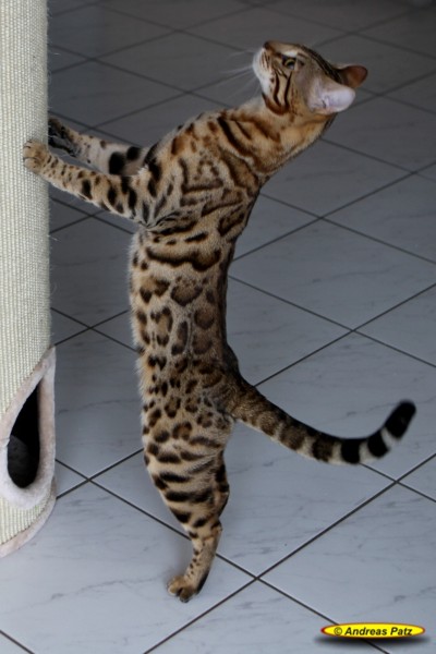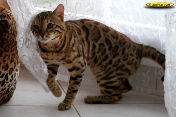 Er hat tolle Rosetten, einen traumhaften Kopf und einen super Körperbau. Sein Schwanz ist wie bei den Bengalen gewünscht kurz und dick. Er hat einen tollen Wildtyp und ist dabei sehr groß (schon 5,5 Kg mit zehn Monaten). Bronte ergänzt unser Zuchtprogramm in idealer Weise. Wir danken Kelly, dass sie uns diesen tollen Ausnahme-Kater anvertraut hat.