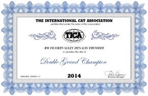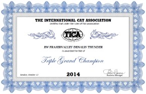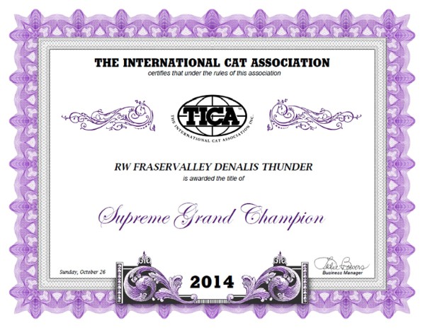 Auf nur drei Ausstellungen hat er bei uns sensationell den höchsten persönlichen Titel "Supreme Grand Champion" geholt (dieser beinhaltet insgesamt sechs Titel: 1. Champion, 2. Grand Champion, 3. Double Grand Champion, 4. Triple Grand Champion, 5. Quadruple Grand Champion, 6. Supreme Grand Champion)