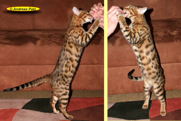 Wir hatten Design Me als Zuchtkatze einer netten Züchterin angeboten. Als diese sich nicht entscheiden konnte, haben wir beschlossen Design Me zu behalten. Dies hat sich als absoluter Glücksgriff sowohl von ihrer Qualität als auch vom Charakter herausgestellt. Sie hat einen tollen Kopf und einen sehr muskulösen idealen Körperbau. Sie hat sehr viel Glitter - soviel haben wir an noch keiner Bengalkatze gesehen. Leider ist das auf den Fotos nicht zu erkennen.