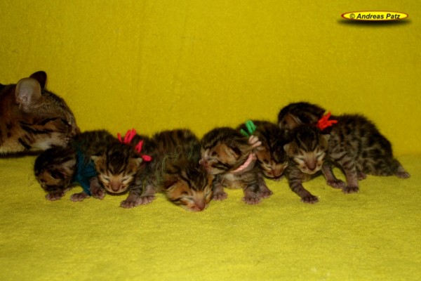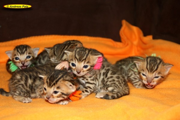 Mai 2015 - Bengalkitten von Wilma Hier die aktuellen Bilder unserer Bengalkitten vom 04.Mai 2015. Diese Kitten werden alle kleine Fernseh-Stars. Ein Kamerateam eines großen deutschen TV-Senders hat die Geburt und die ersten Tage der Kleinen gefilmt. Wir informieren euch rechtzeitig wo und wann der Beitrag ausgestrahlt wird. Wenn Ihr Interesse an einem oder zwei Bengalkitten von uns habt, nehmt bitte über unser Kontaktformular, per Mail an Info@Bengal24.de oder telefonisch Kontakt mit uns auf. Telefon: 02771/320250 (14:30 - 20:00 Uhr)